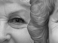 Далее переходим к обработке фотографии, которую предоставил клиент. Практически все исходные снимки нуждаются в качественной ретуши, так как получившийся на памятнике портрет должен быть контрастным, иначе он окажется нечётким. Мы обрисовываем контуры волос, области глаз, дорисовываем брови, делаем более выразительными все морщины на лице. На снимках представлен предоставленный файл, результат после ретуши, и выраженные крупным планом отличия.