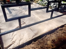 Затем мы сварили по периметру могилы борта из металлических полос, которые и будут являться границей брусчатки. Земля была застелена геотекстилем, который и предотвратит прорастание травы сквозь швы между плитками.